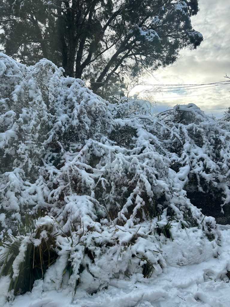 The day was magical until things got serious. No one expected it to get quite as serious as it did. We fortunately decided to stay put, content with the amount of snow on our street and food in the cupboard. Between 15 and 40cms of snow felL Depending on where you were on the tablelands. It was wild. We didn’t lose power. But We learned that the chain reaction of Snow making evergreen tree branches heavy (especially native eucalypts that are prone to dropping large limbs without warning even in fine weather) onto power lines is the main risk; well that and not being able to get anywhere unless you own a truck. People got stuck on roads and lots of folks lost power. The clean up is proving tricky with stray branches everywhere all over the place. Some still teetering in the trees above us. The university campus is a mess. closed all week. so is my son’s school which is in a heavily wooded area. I guess if we had snow storms more often all the trees would be ready for the load (evolved over the long term not to drop branches so chaotically, or just pruned accordingly). These things, the closures, the damage, the power outages are very frustrating. Although This is a non-sequitur, I feel like sharing that one of my favourite albums of all time is called “The POwer Out”.