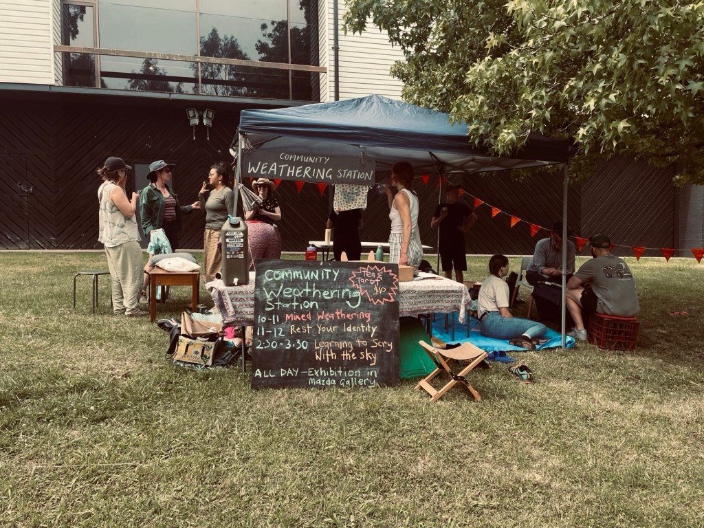 The Community Weathering Station started in Armidale in the drought of 2019. The firST time it was at Black Gully Festival the Festival was A dust bowl. THE image below is from that day in 2019.