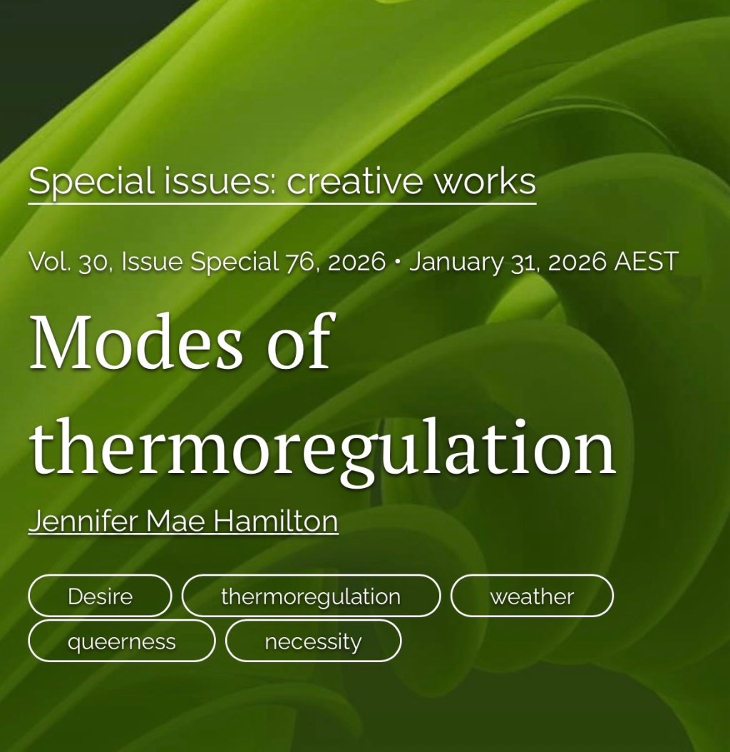 This essay was a long time in the making. https://textjournal.scholasticahq.com/article/155456-modes-of-thermoregulation I’m really proud of it as i haven’t written memoir quite like it before. It spans a formative decade in my life. It started as being about our relationship with weather and concrete…